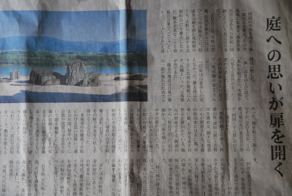 1995年、当時の住職、吉田宥勝さん(74)はひとつの決断をした。枯山水の庭を囲む築地塀のうち、吉野川に面する北側約25mを撤去したのだ。無茶苦茶なことを徳島の言葉で「ごじゃ」という。「ごじゃしよる」と周囲は心配した。塀の高さは1mほど。「あれを取ったら、客殿から見える景色がまったく変わりました」と回想するのは宥勝さんの息子で、現住職の宥玄さん(46)だ。「以前は山並みしか見えなかった。撤去後は広々した川が視野に入り、壮観というか、立体感が出てきた」 撤去の理由は台風で塀の一部が壊れたためでもあった。禍を転じて福となすか。2018年「四国八十八景」のひとつに選ばれた。